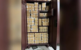 Pictures of the raid show two mountains of money placed in two large cupboards. All bundles were wrapped in a plastic cover and fastened with yellow tape. In each picture there are more than 30 such bundles visible.