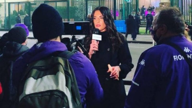 A man is photographed moving hands towards Greta Bacaglia while looking at the camera when a Serie A soccer match in Florence.